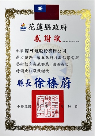 傑可達持續透過顯示科技與數位設備應用,支持教育活動的展示與推廣,讓更多師生與社會大眾能夠清晰看見教育成果與學習歷程。此次再度獲頒感謝狀,不僅象徵企業長期投入教育領域的努力,也顯示花蓮縣政府對教育合作夥伴的肯定與支持。