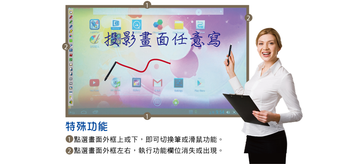 .書寫/板擦:可標示/寫字/繪圖及更換書寫顏色及粗細等,並可擦拭