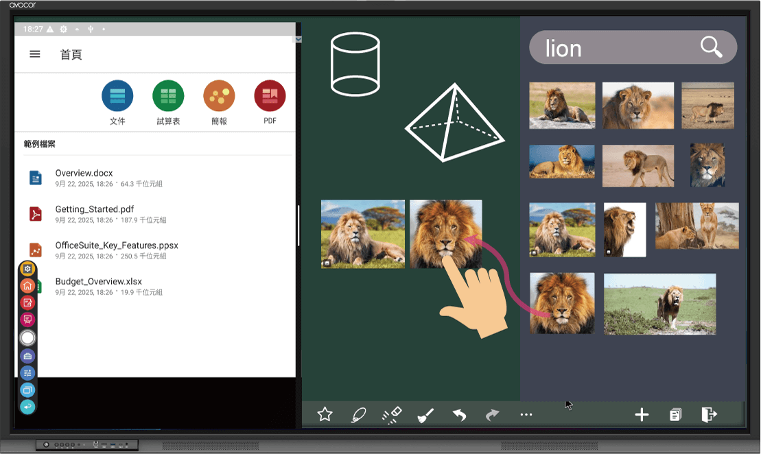 將課堂搬上雲端-擴展教學場域,補充教學資訊,快速查詢網路內容或選儲存在白板或雲端的課程檔案。