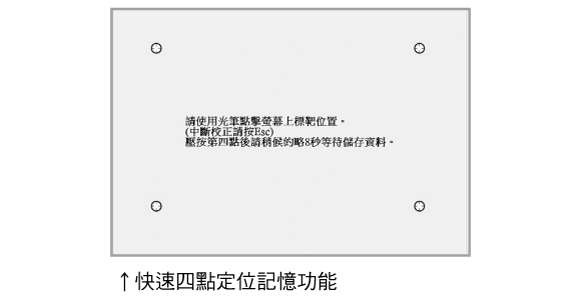 採用與鏡頭同軸設計的互動定位設計,出廠內定投影80~90 吋免定位功能。如需重新定位也只要快速的四點定位即可,定位訊息儲存在互動投影機內,日後移動投影機或調整畫面大小,都不需重新定位,是行動互動教學的最佳解決方案。