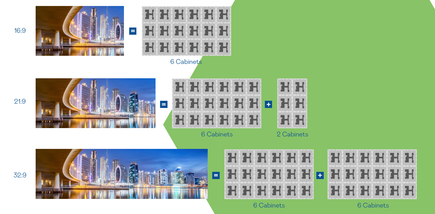 AUO Display Plus LX-130 LED 拼接顯示系統由於其靈活的模塊化設計,屏幕尺寸16:9,可以擴展21:9、32:9等特殊尺寸配置,以滿足需要更大規模和更身臨其境的視覺體驗的應用,如控制室、展示廳和會議廳。