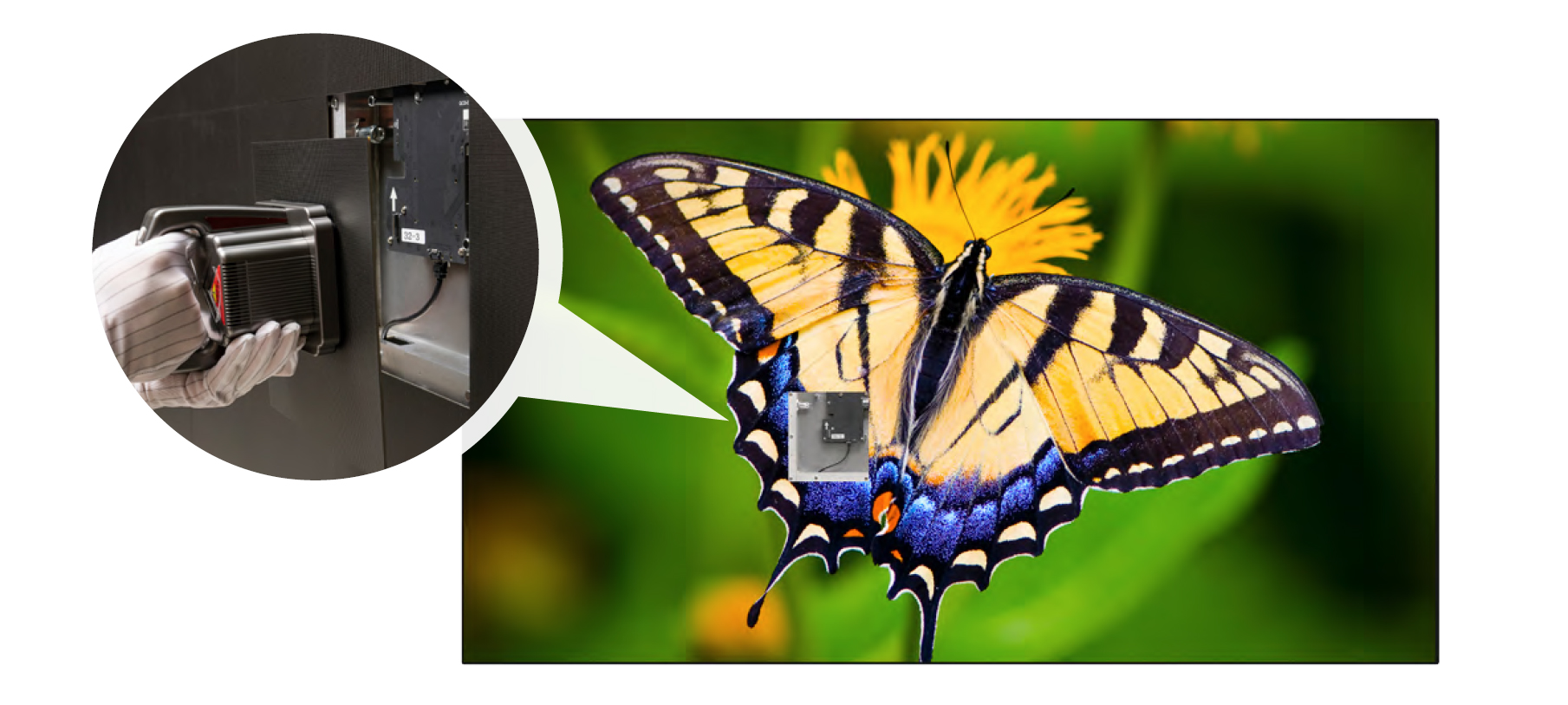 AUO Display Plus LX-130 LED 拼接顯示系統模塊化設計維護更換 LED 模塊,無需移動整個顯示器或從困難的位置進入。可熱插拔的 LED 模塊可以使用真空抽吸工具輕鬆移除,以便從正面進行快速維護。