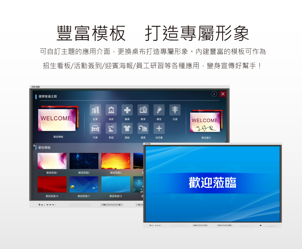 | 產品特點 | 支援雙系統 – Windows / Android;白板模式、畫面共享、預覽訊號、前置喇叭、定時開關機、USB直接讀檔、USB 3.0 攝影機支援、白板互動軟體、螢幕錄製、客製化主題及桌布設定、可自訂懸浮工具列功能 |