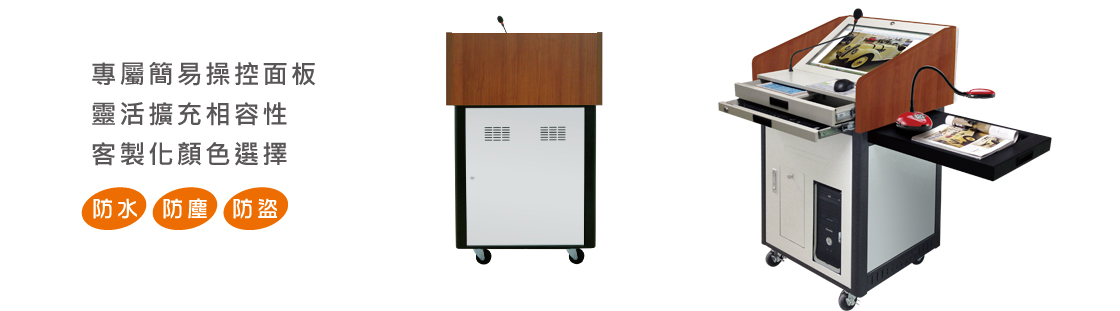 容易上手的操作介面,不需學習可直覺使用,設有左右扶手、鵝頸麥克風及傾斜式面板,適合各種身高之講者。